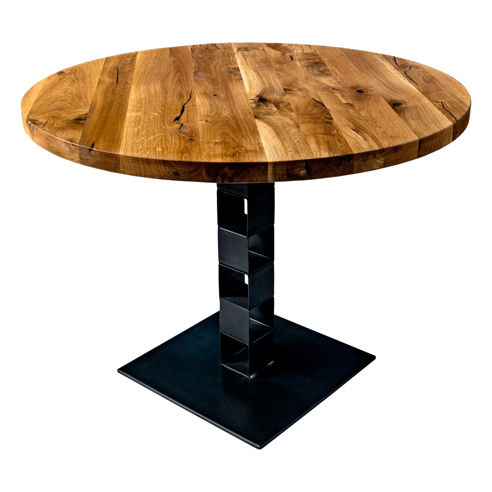 Sto je izrađen od hrastovog drveta, debljina ploče 40 mm okruglog oblika. Nogari su izrađeni od cijevi debljine 100 x 100 x 2 mm, Postolje dimenzija 500 x 500 izradjeno je od lima 10 mm. Ploča: HRAST, debljina 40 mm